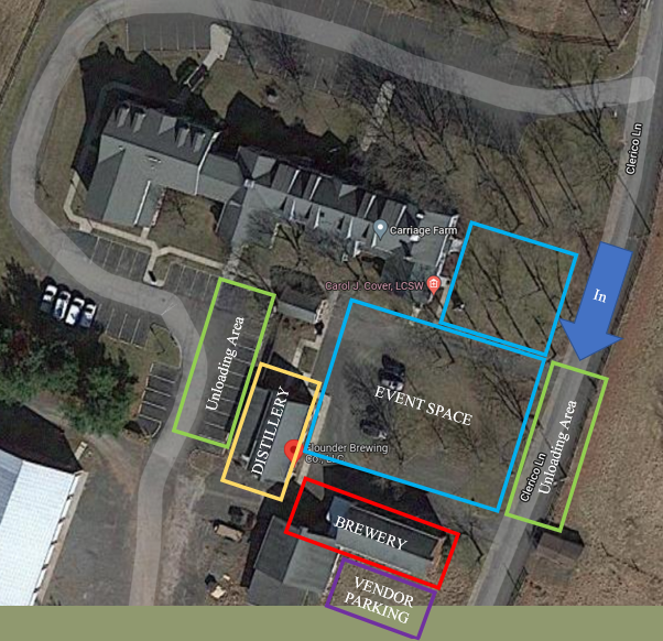Upon arrival at the brewery, please unload only at the two gravel path entrances OR the parking lot behind the distillery. Only food trucks and coffee trailers will be able to drive up to their spots. Marketspace staff will direct you.